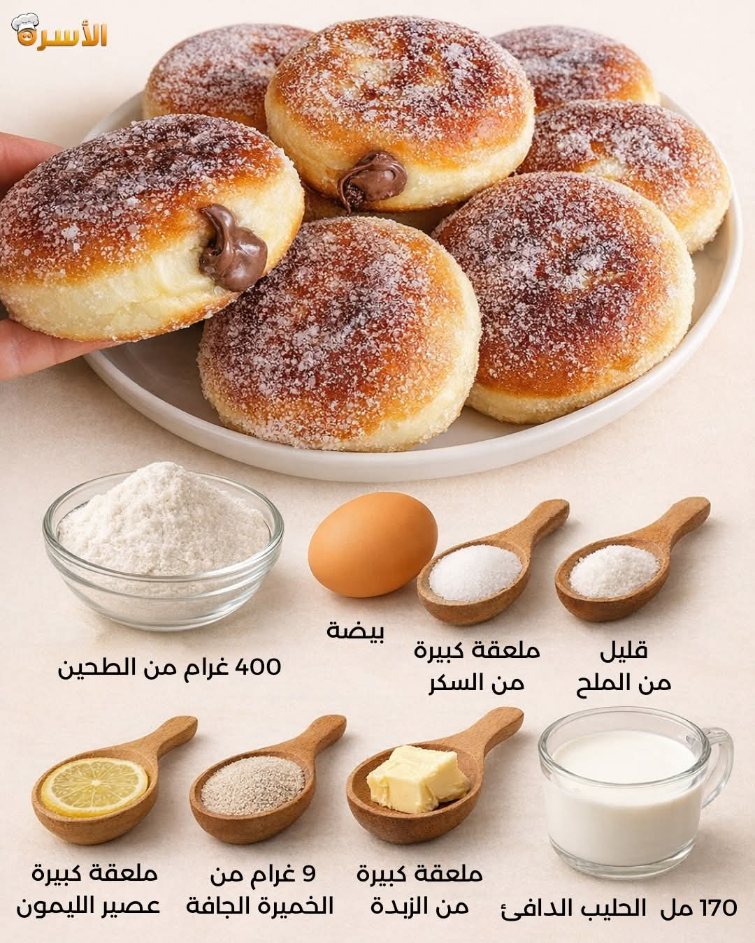 كنخلطو الحليب الدافئ + السكر + الخميرة ونخليوهم 5 دقايق.